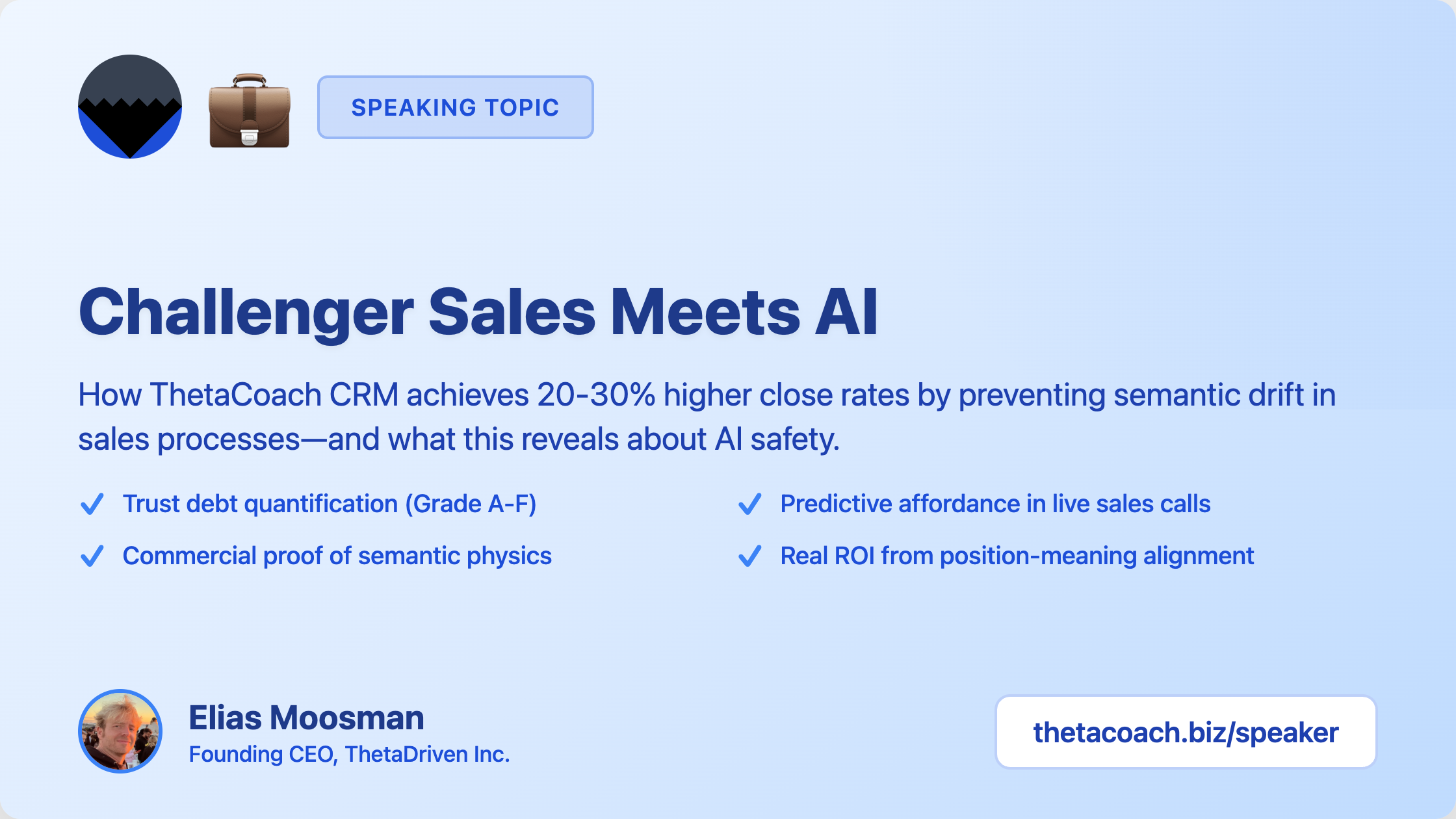 The talk IS the demo. Watch Elias deliver a Challenger Sales arc while the battle card runs live on screen. The physics of drift: why ungrounded meaning serves whoever shouts loudest. The FIM artifact passes around as physical proof. Meta-demo format: selling as talking.