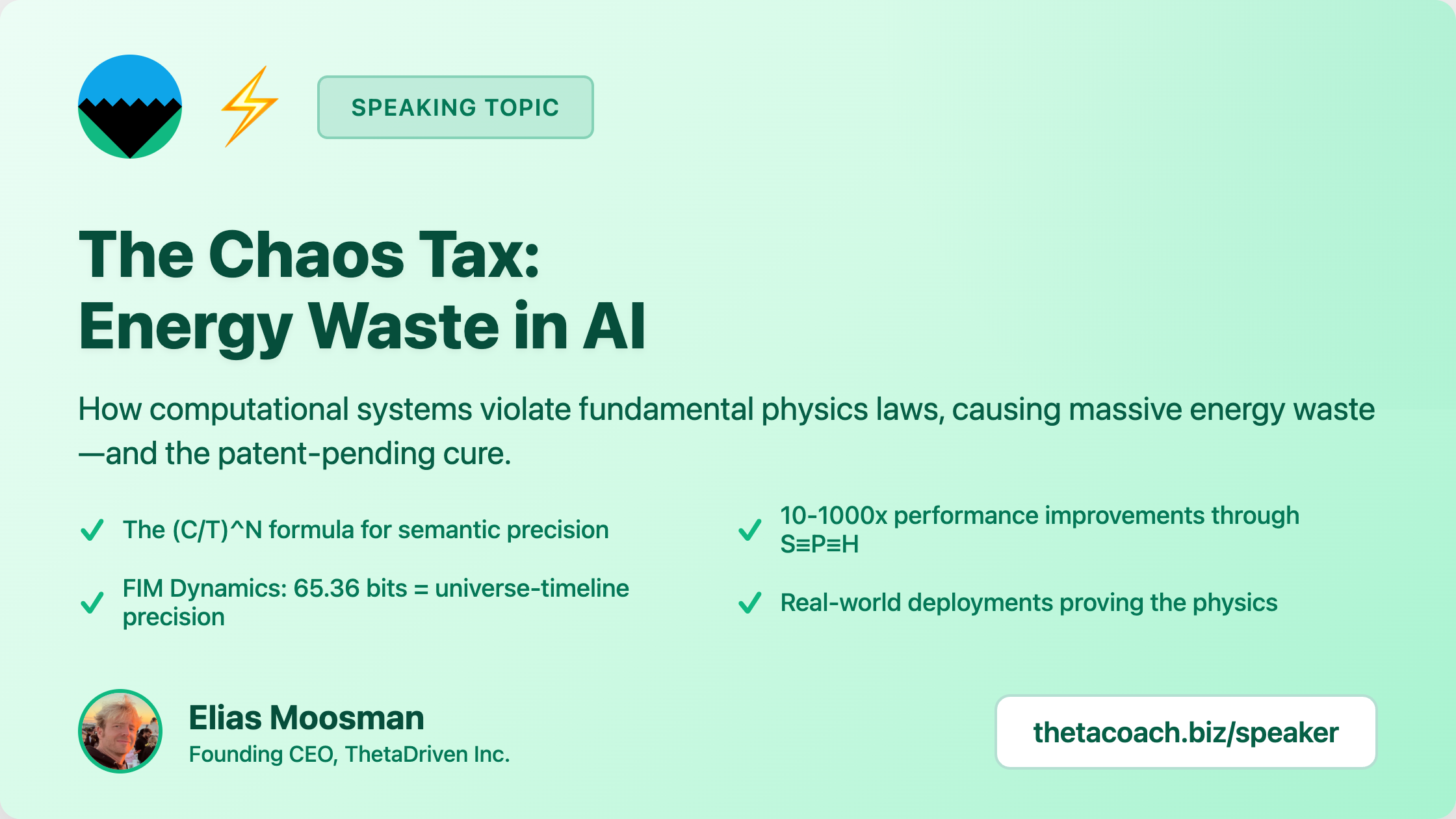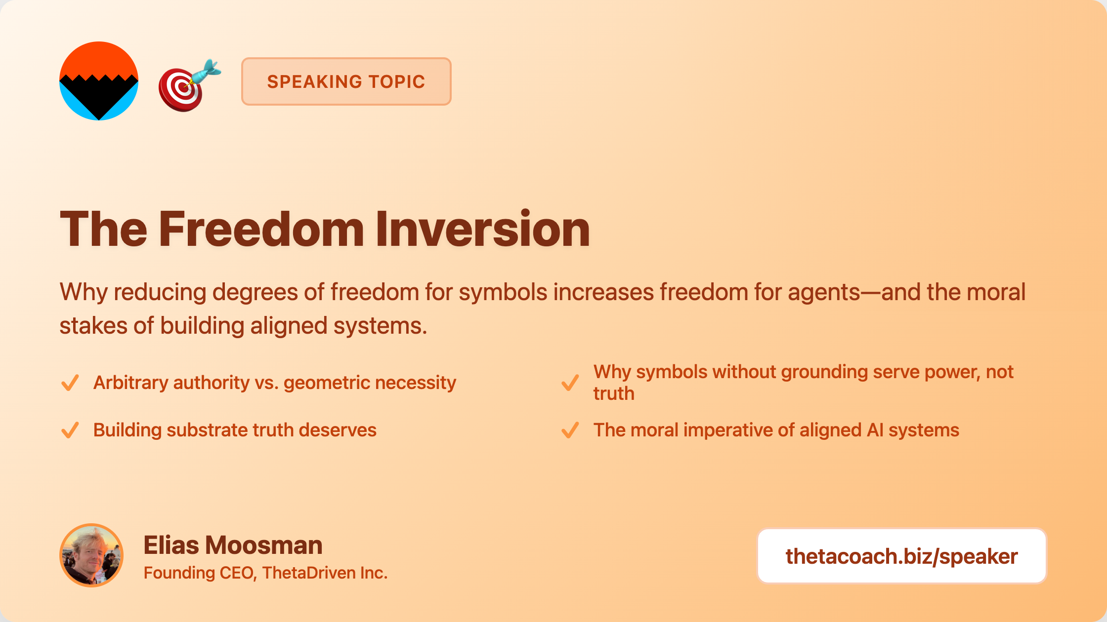 Elias Moosman spent 25 years proving the same counterintuitive pattern across wildly different domains—from consciousness research to Fortune 500 management—before discovering the mathematical proof: the right constraints create freedom. As Founding CEO of ThetaDriven Inc. and inventor of the patent-pending Fractal Identity Map (FIM), he's now focused on licensing this "Tesseract Physics" framework to AI leaders to solve the alignment crisis through provable verification, not vague promises. His work powers products like ThetaCoach (AI-powered CRM) and IntentGuard (open-source AI safety), and is detailed in his book Tesseract Physics - Fire Together, Ground Together: the case for why symbols without grounding serve whoever controls definitions—and the mathematical alternative.